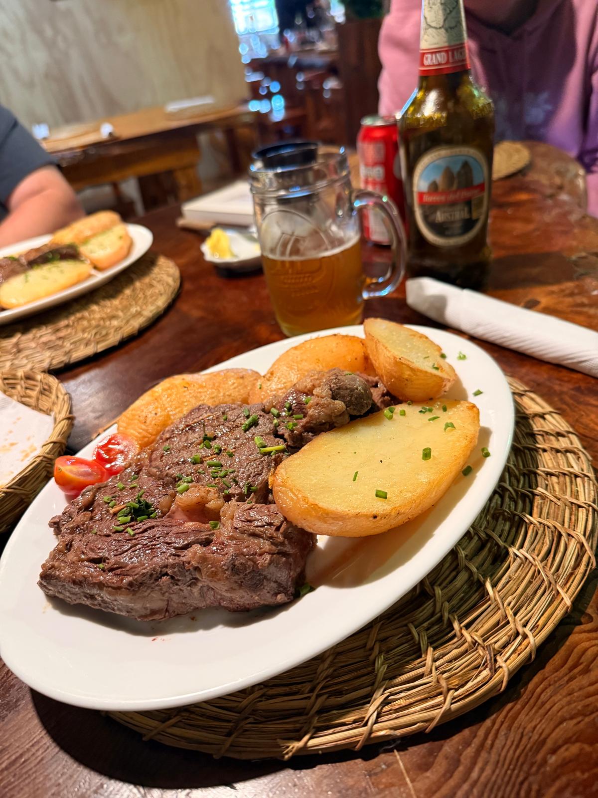 V posledním městě před trajektem jsme se zastavili na jídlo. Dali jsme si pořádnou flákotu steaků, které vypadaly, jako by ještě před chvílí mohly utéct z talíře. Bylo to přesně to co jsme po dlouhém dni potřebovali.